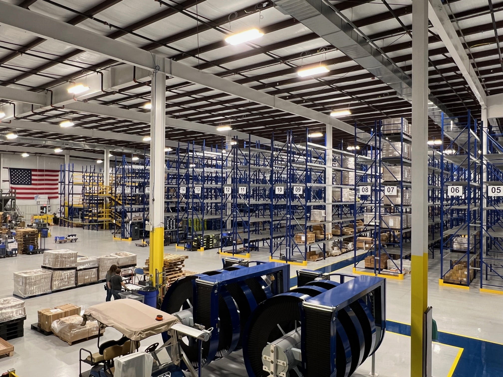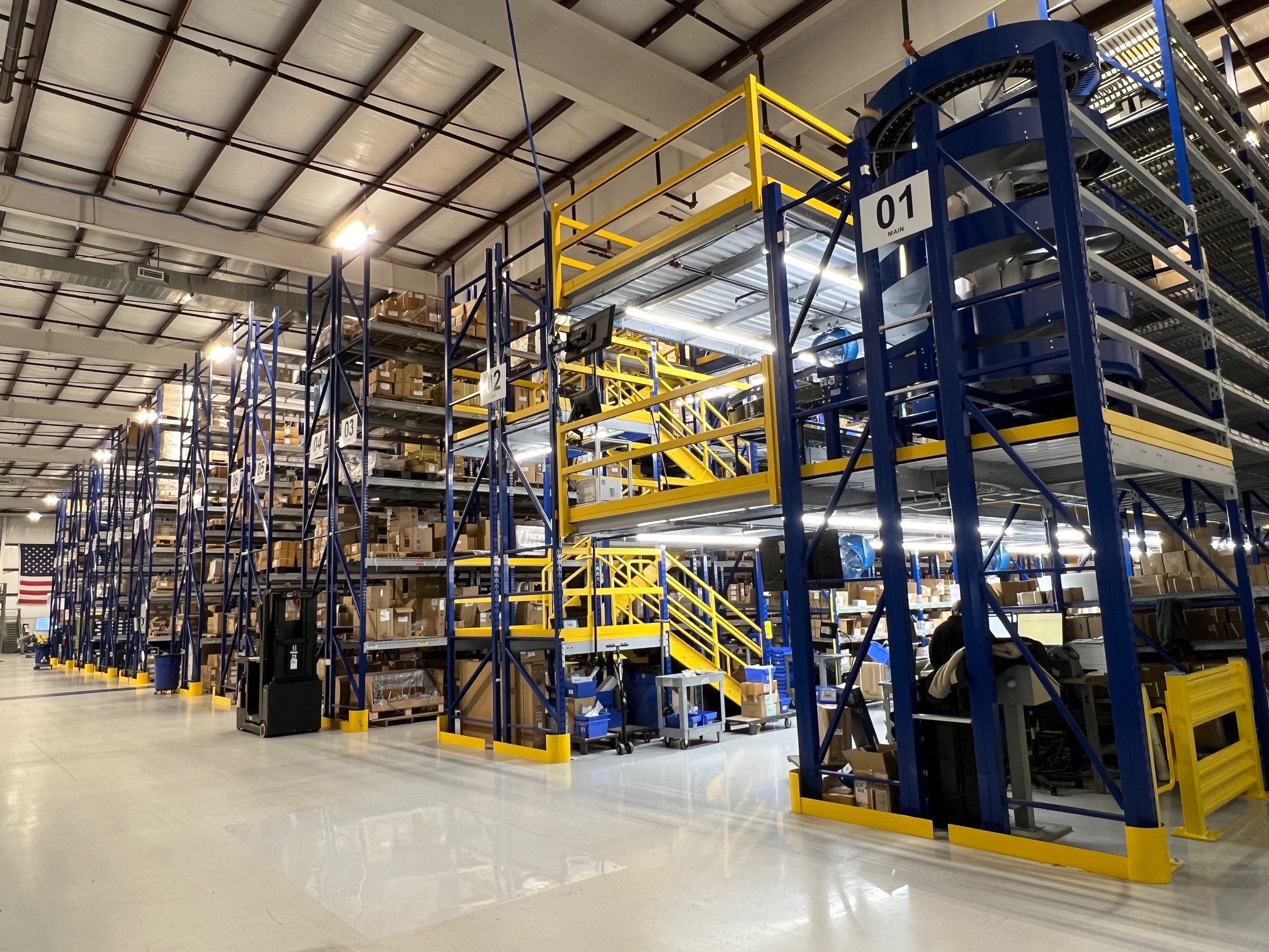 A three-level pick module houses material for manufacturing and assembly. Another on the opposite side of the warehouse houses finished goods.
