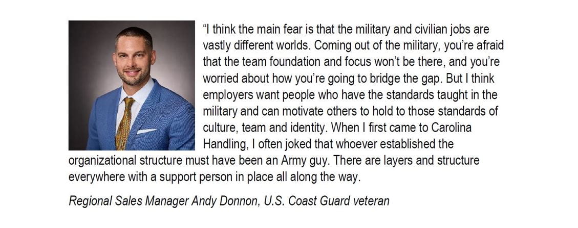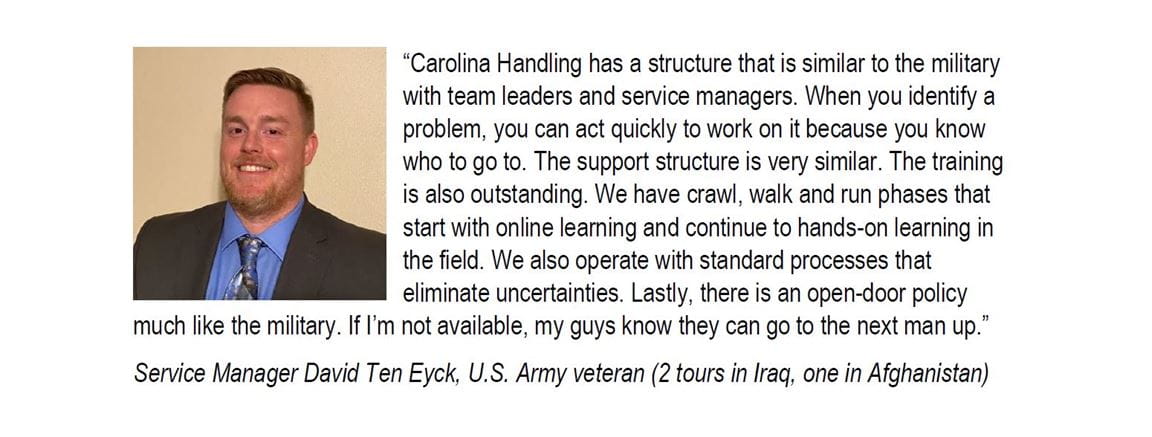 See what Service Manager David Ten Eyck, U.S. Army veteran and Regional Sales Manager Andy Donnon, U.S. Coast Guard veteran have to say about working at Carolina Handling.